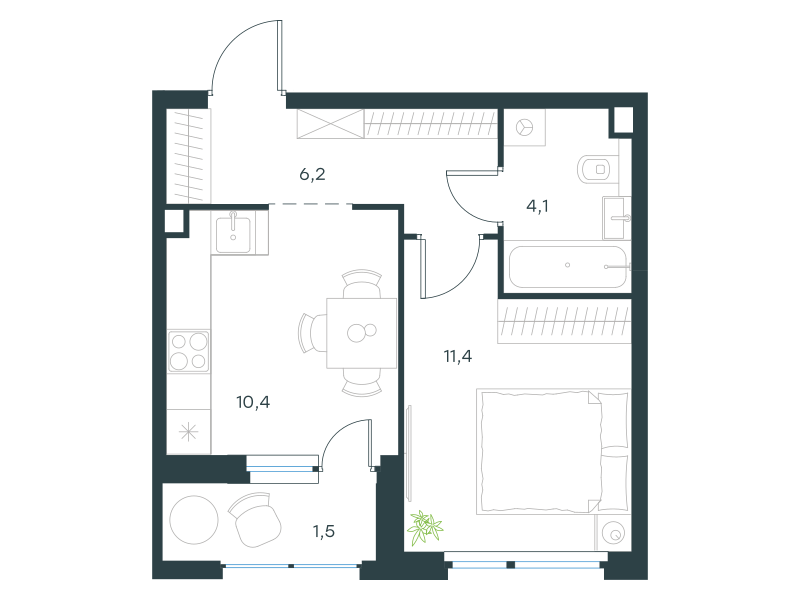 Однокомнатная квартира, 33.6 кв. м