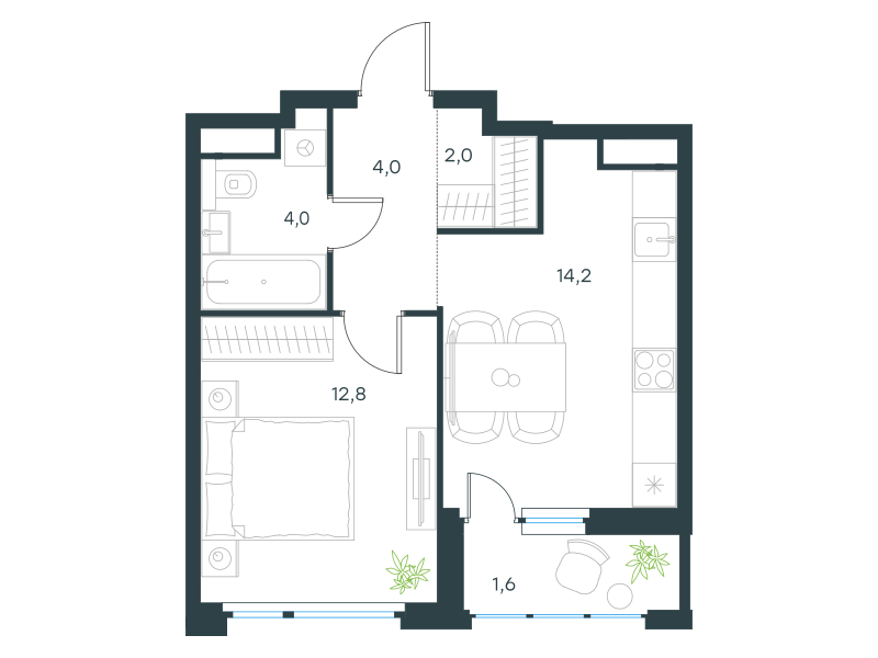 Однокомнатная квартира, 38.6 кв. м