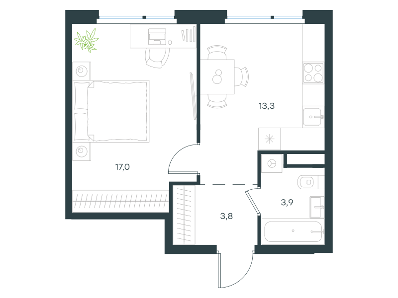 Однокомнатная квартира, 38.0 кв. м