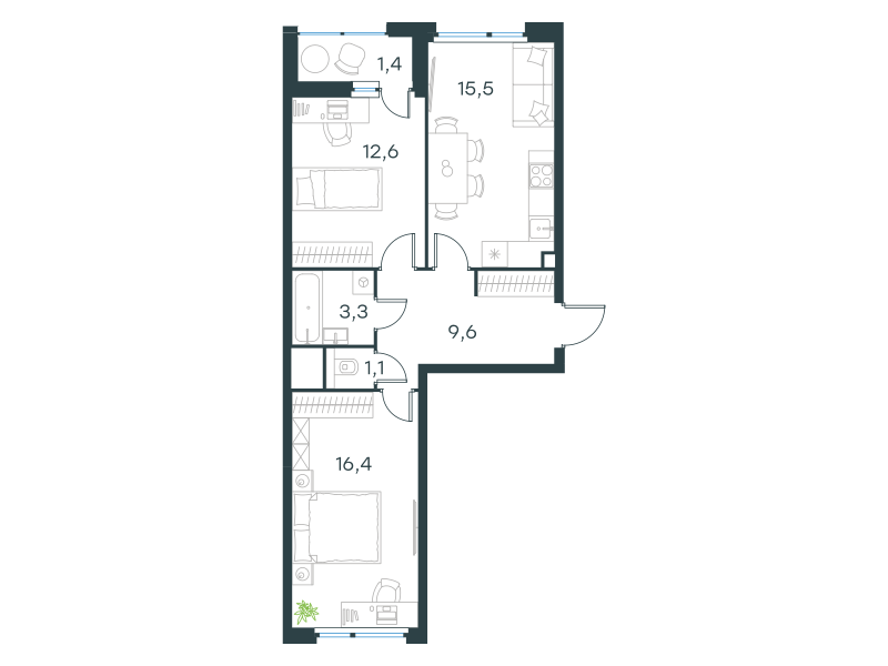 Двухкомнатная квартира, 59.9 кв. м