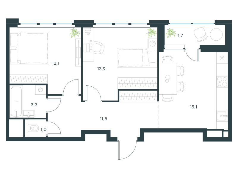 Двухкомнатная квартира, 58.6 кв. м