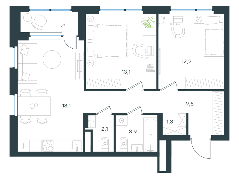 Двухкомнатная квартира, 61.7 кв. м