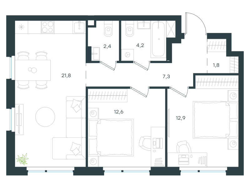 Двухкомнатная квартира, 63.0 кв. м