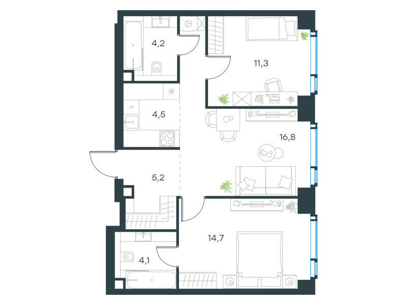 Трехкомнатная квартира, 60.8 кв. м