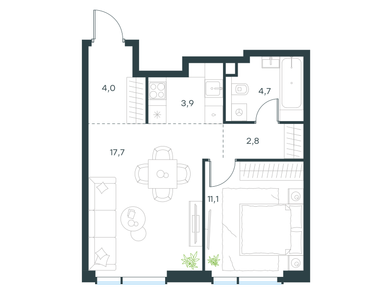 Двухкомнатная квартира, 44.2 кв. м