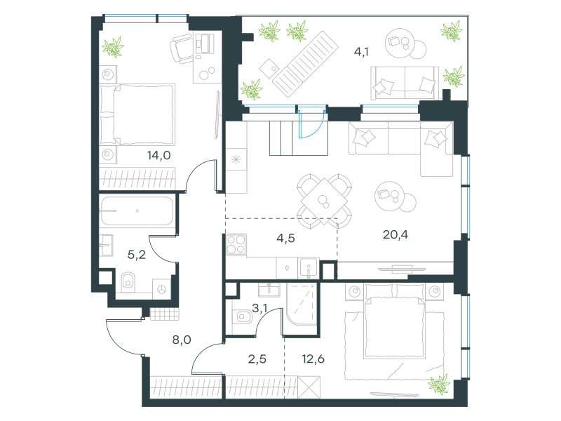 Трехкомнатная квартира, 74.4 кв. м
