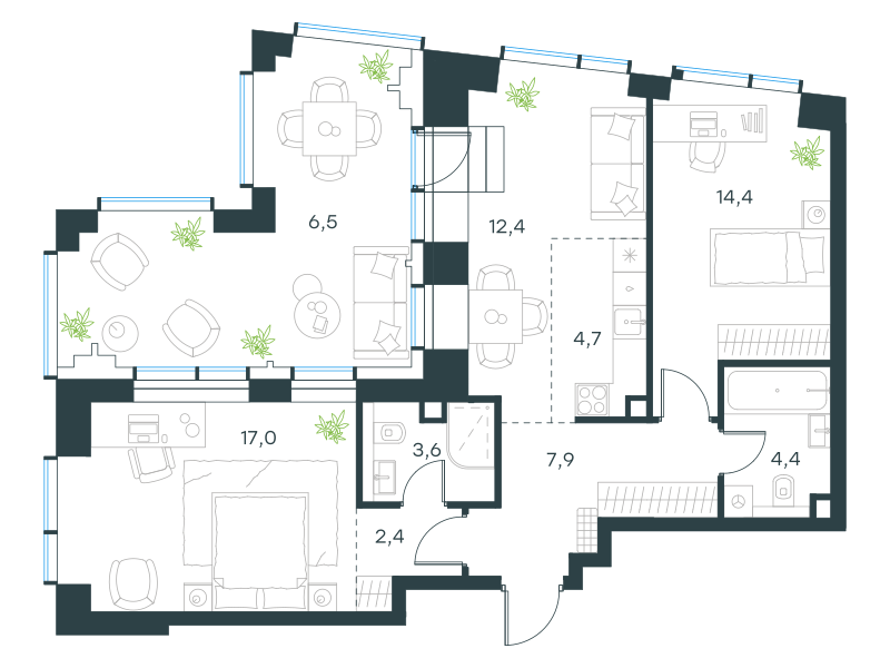Трехкомнатная квартира, 73.3 кв. м