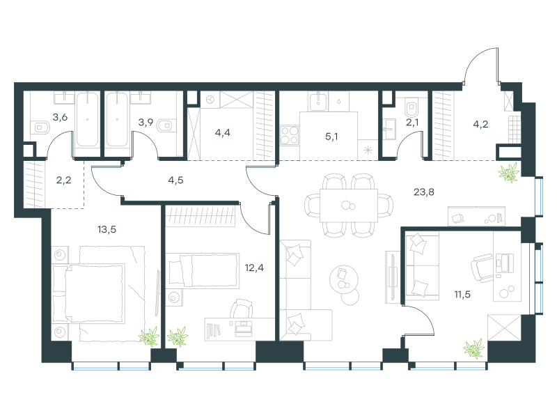 Четырехкомнатная квартира, 91.2 кв. м
