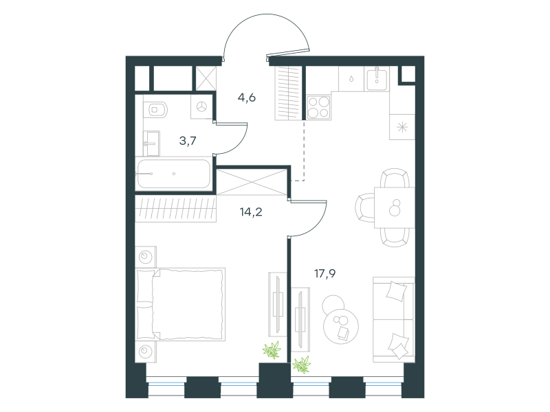 Однокомнатная квартира, 40.4 кв. м