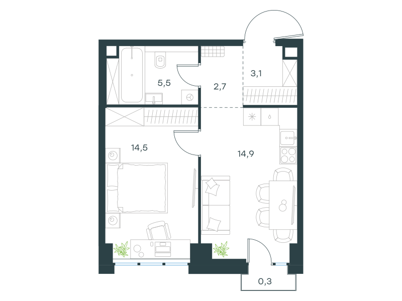 Однокомнатная квартира, 41.0 кв. м