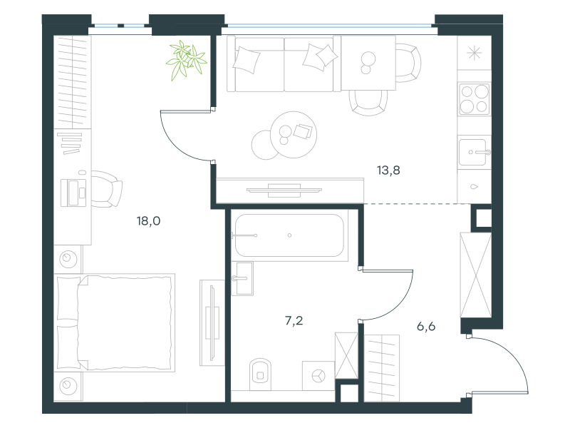 апартаменты, 45.6 м2