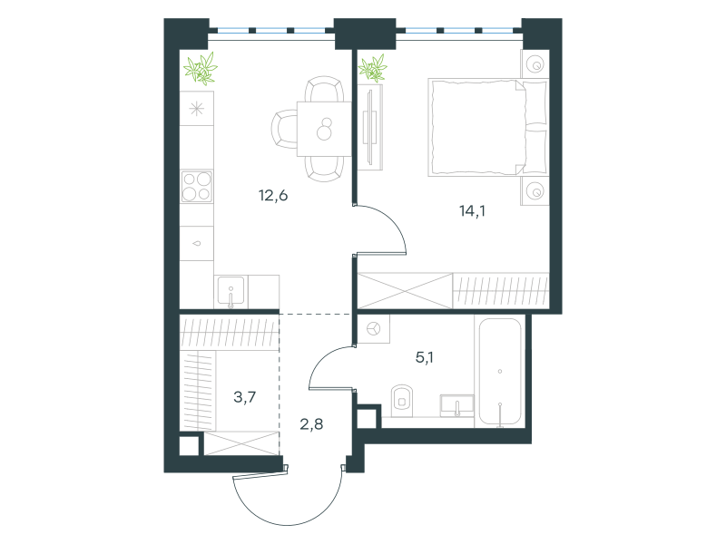 Однокомнатная квартира, 38.3 кв. м