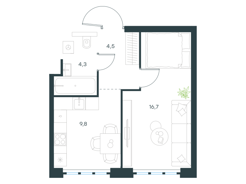 Однокомнатная квартира, 35.3 кв. м