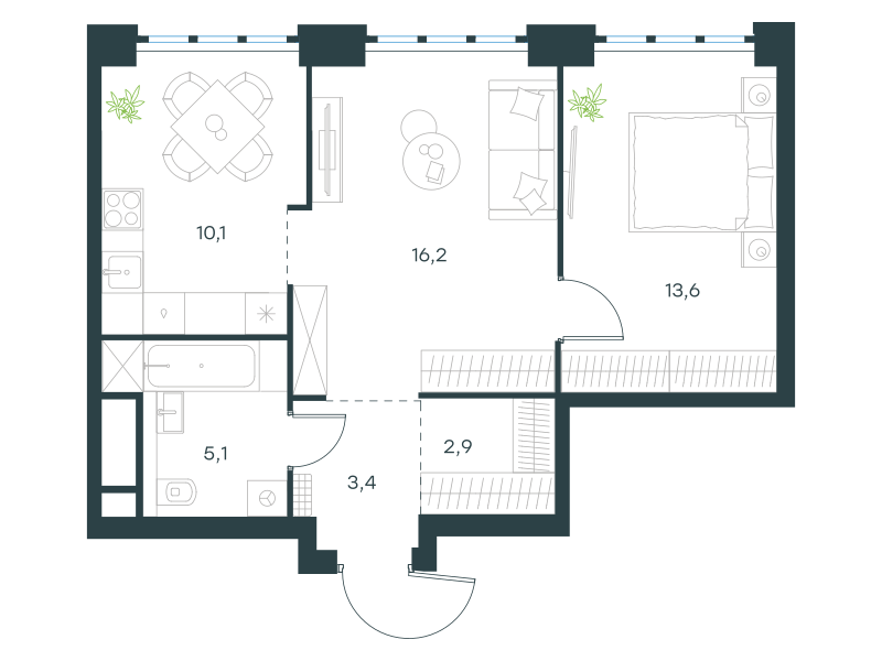 Двухкомнатная квартира, 51.3 кв. м