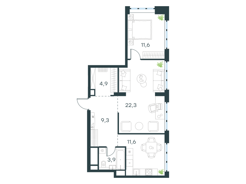 Двухкомнатная квартира, 63.6 кв. м