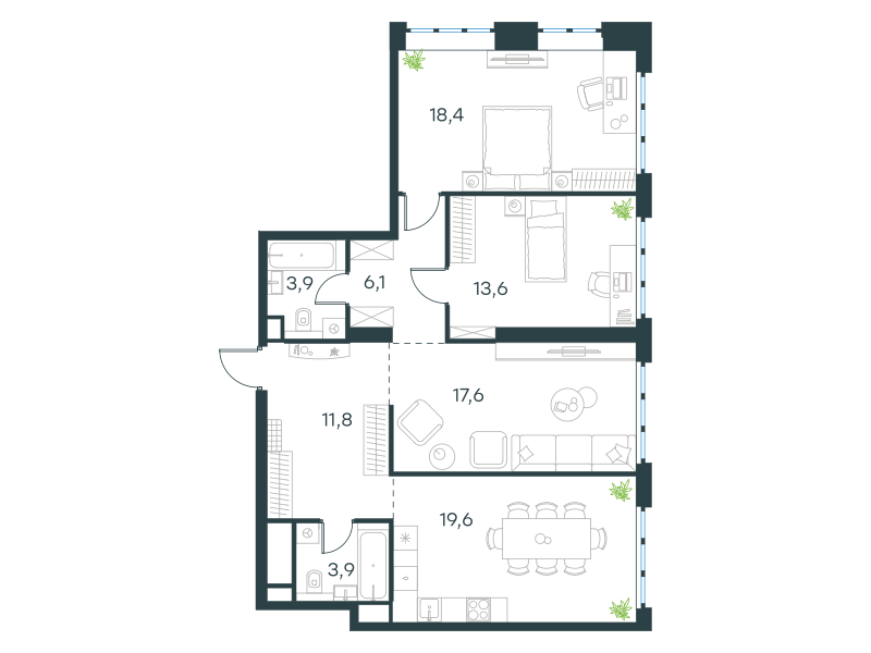 Трехкомнатная квартира, 94.9 кв. м