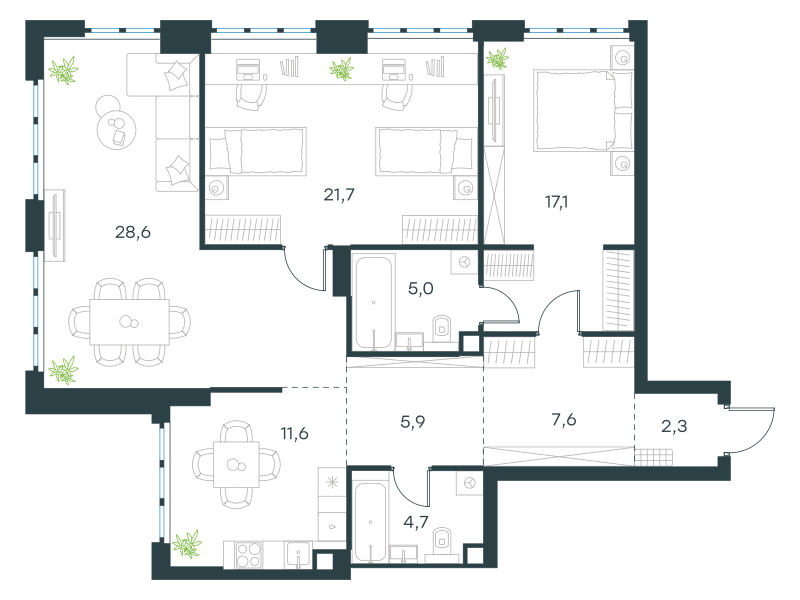 Трехкомнатная квартира, 104.5 кв. м