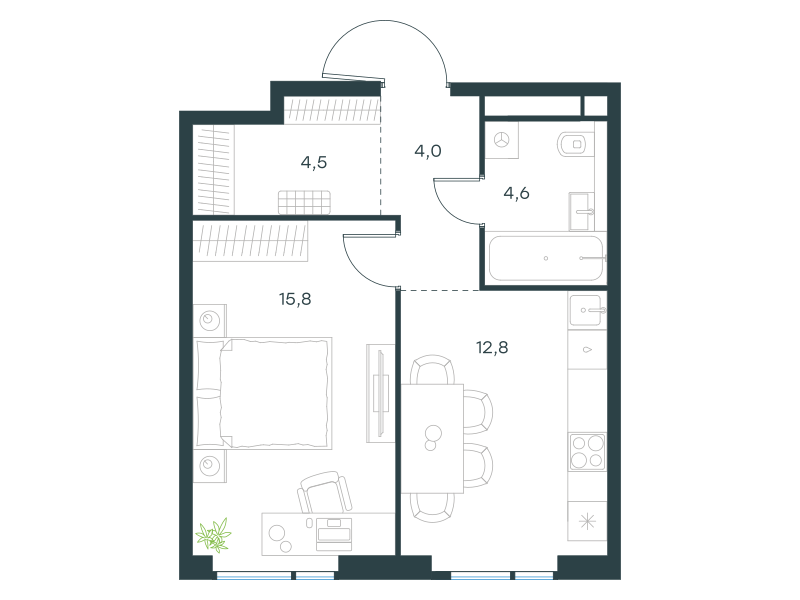 Однокомнатная квартира, 41.7 кв. м