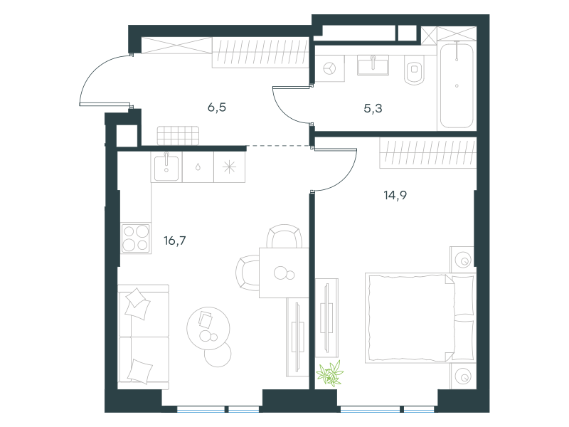 Однокомнатная квартира, 43.4 кв. м
