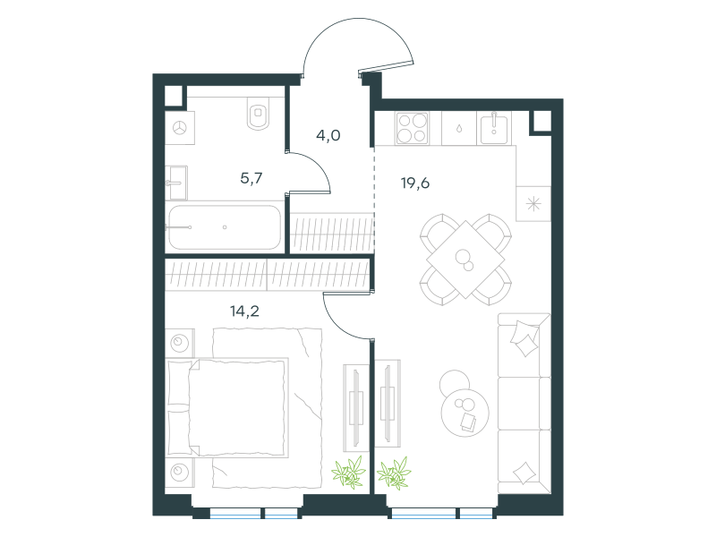 Однокомнатная квартира, 43.5 кв. м