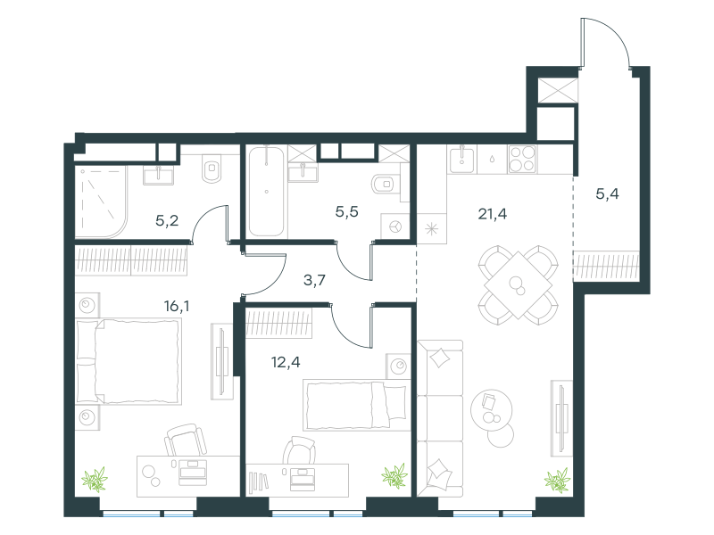 Двухкомнатная квартира, 69.7 кв. м