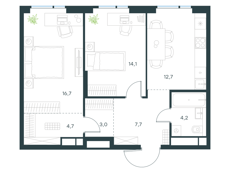 Двухкомнатная квартира, 63.1 кв. м