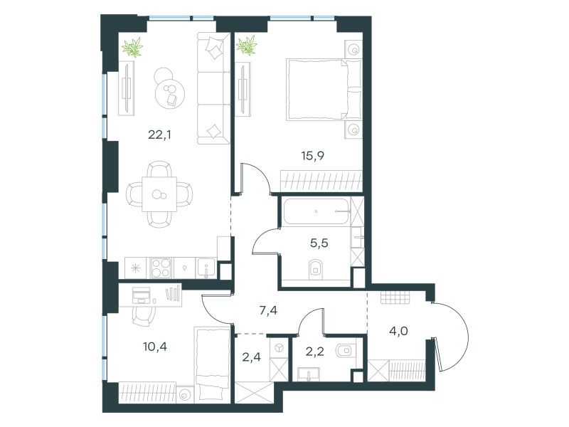 Двухкомнатная квартира, 69.9 кв. м