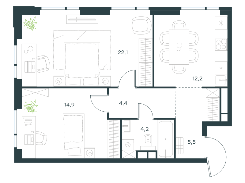 Двухкомнатная квартира, 63.3 кв. м