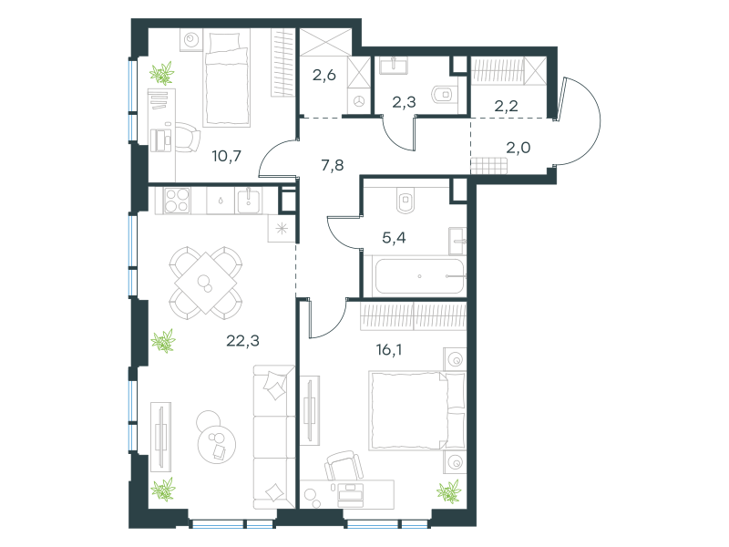 Двухкомнатная квартира, 71.4 кв. м