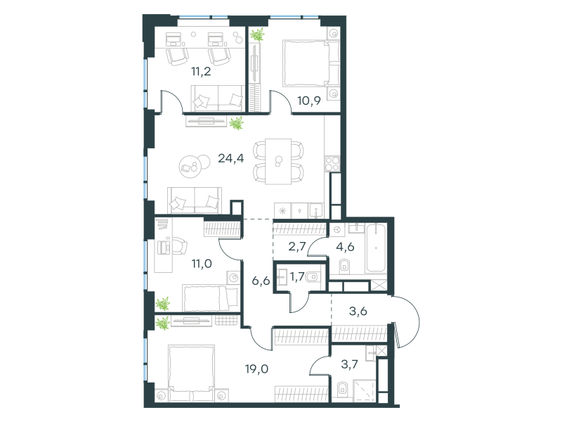 Четырехкомнатная квартира, 99.4 кв. м