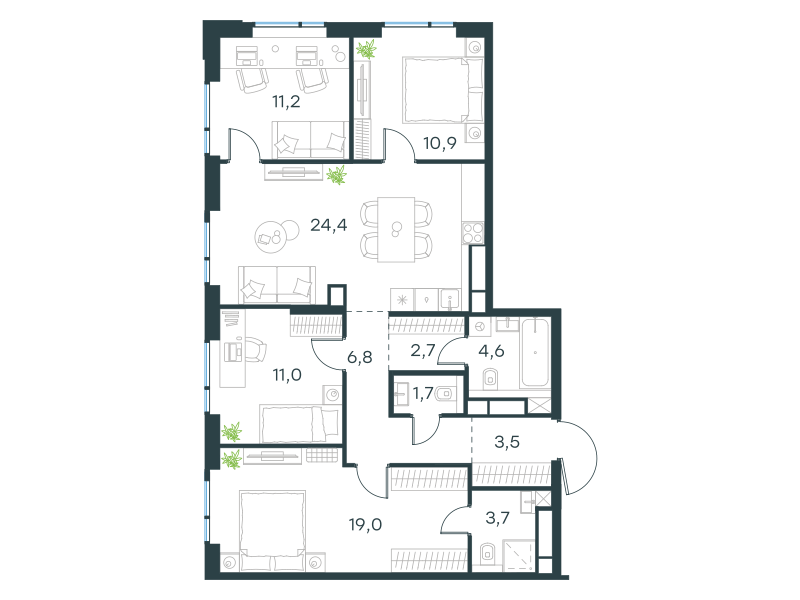Четырехкомнатная квартира, 99.5 кв. м