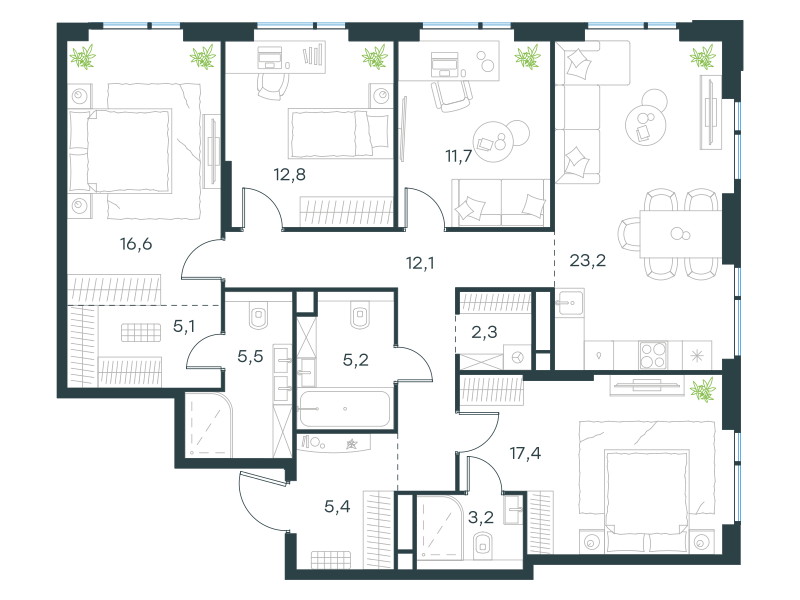 Четырехкомнатная квартира, 120.5 кв. м