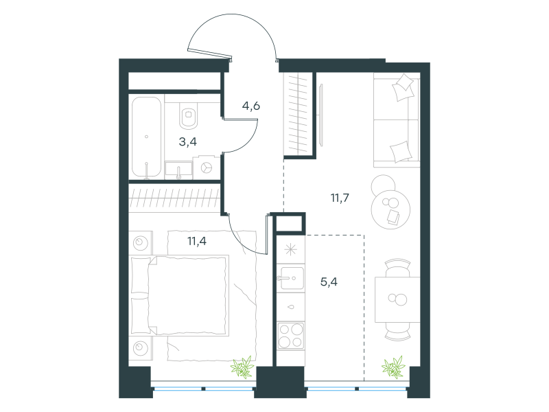 Двухкомнатная квартира, 36.5 кв. м
