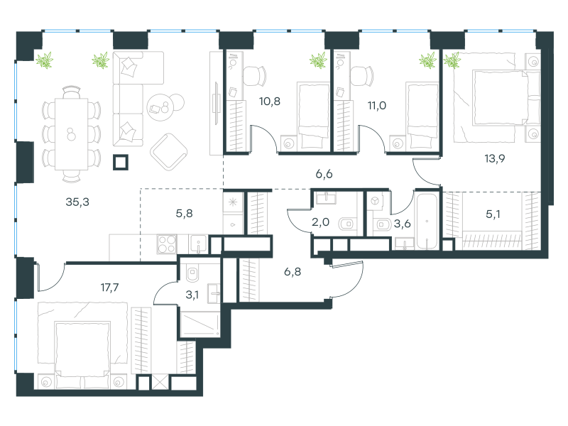 Пятикомнатная квартира, 121.7 кв. м